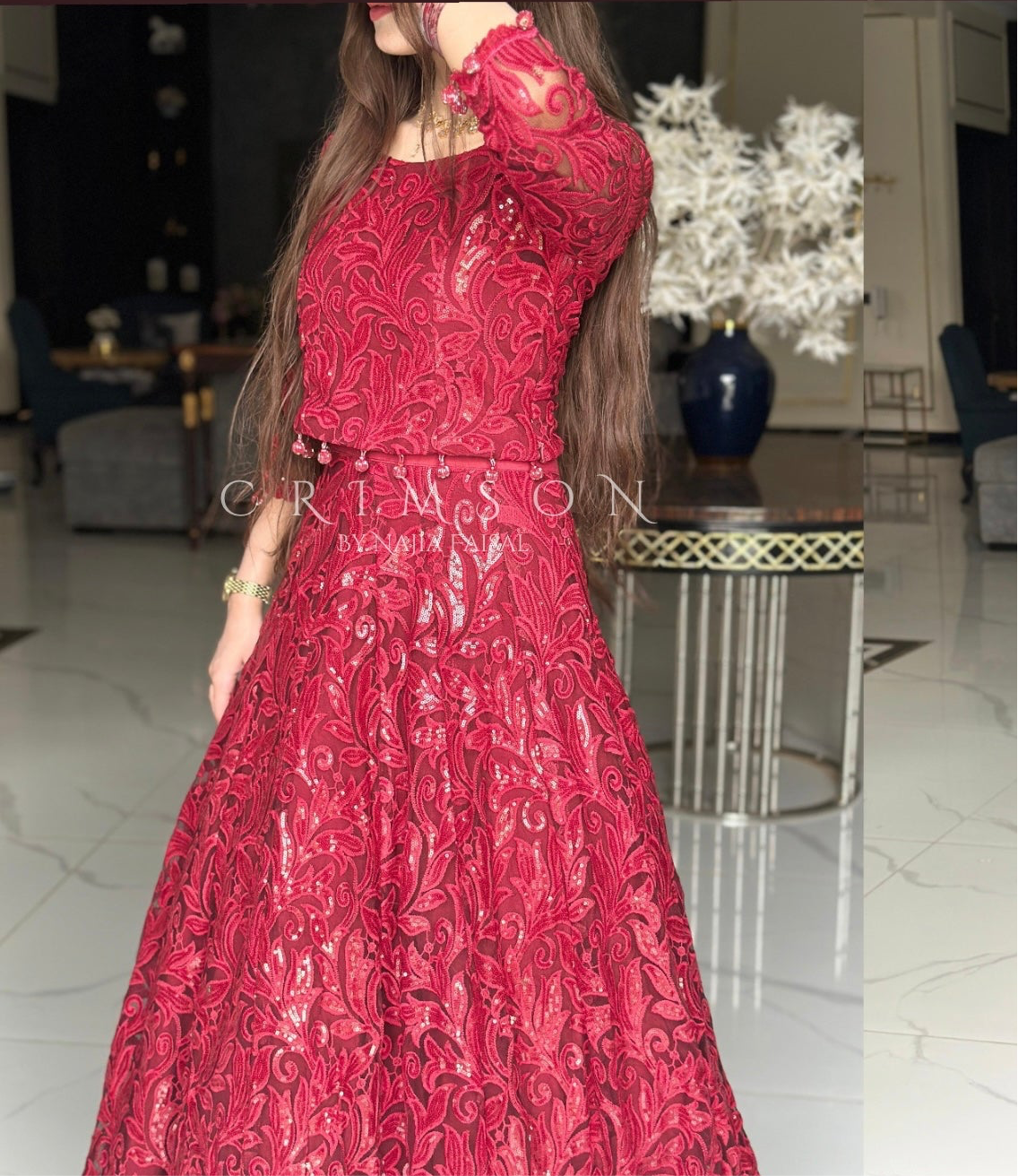Envision a stunning, bold maroon lehenga crafted from luxurious fabric. The skirt features intricate statement embroidery and shimmering sequins, catching the light with every move. The blouse, with a deep neckline, is adorned with zari work and sparkling sequins completes this elegant and sophisticated ensemble, perfect for any grand occasion.