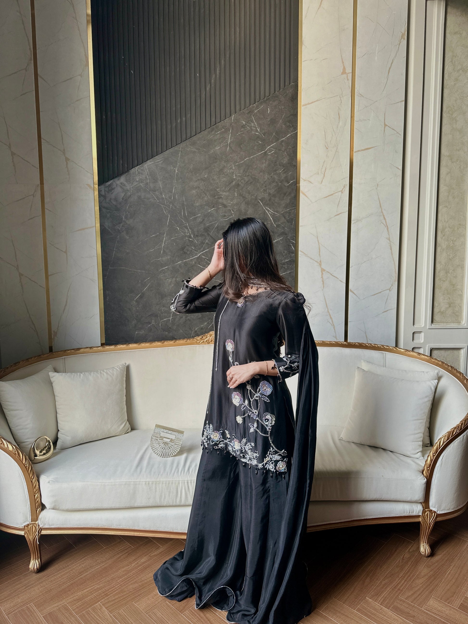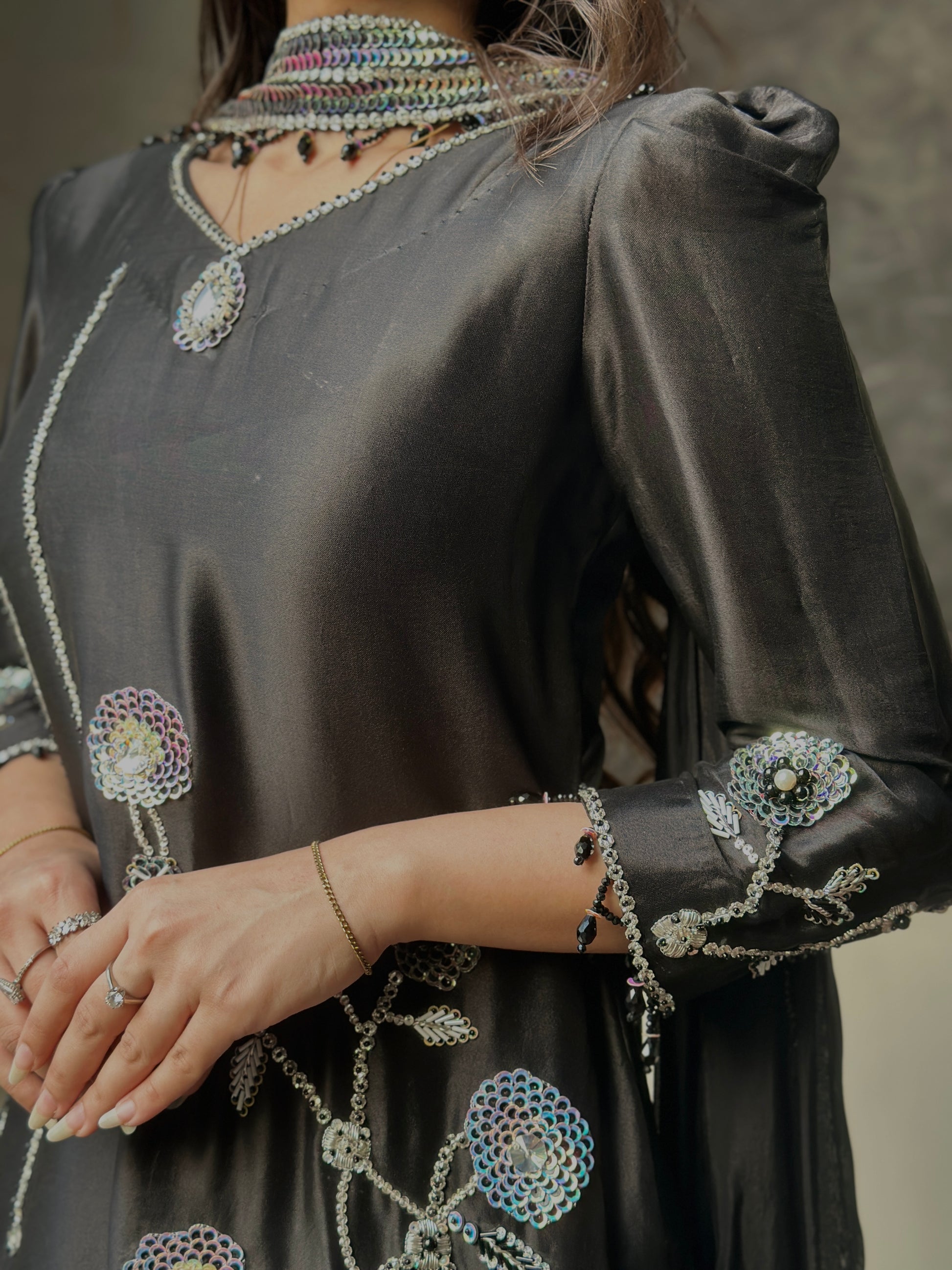 KOEL- This elegant three-piece ensemble exudes timeless sophistication with its jet-black base and delicately detailed embellishments. The long, flowy shirt crafted from luxurious sheesha silk features intricate floral embroidery in silver and pastel tones, adorned with subtle bead and sequin work along the hem and sleeves. Paired with wide-legged sharara-style pants in medium silk, the outfit creates a graceful silhouette that moves beautifully with every step. The sheer medium silk dupatta adds a soft, ethereal touch, completing the look with understated elegance. Perfect for evening occasions or festive gatherings, this outfit blends traditional artistry with a contemporary edge, making it a statement piece of refined beauty.