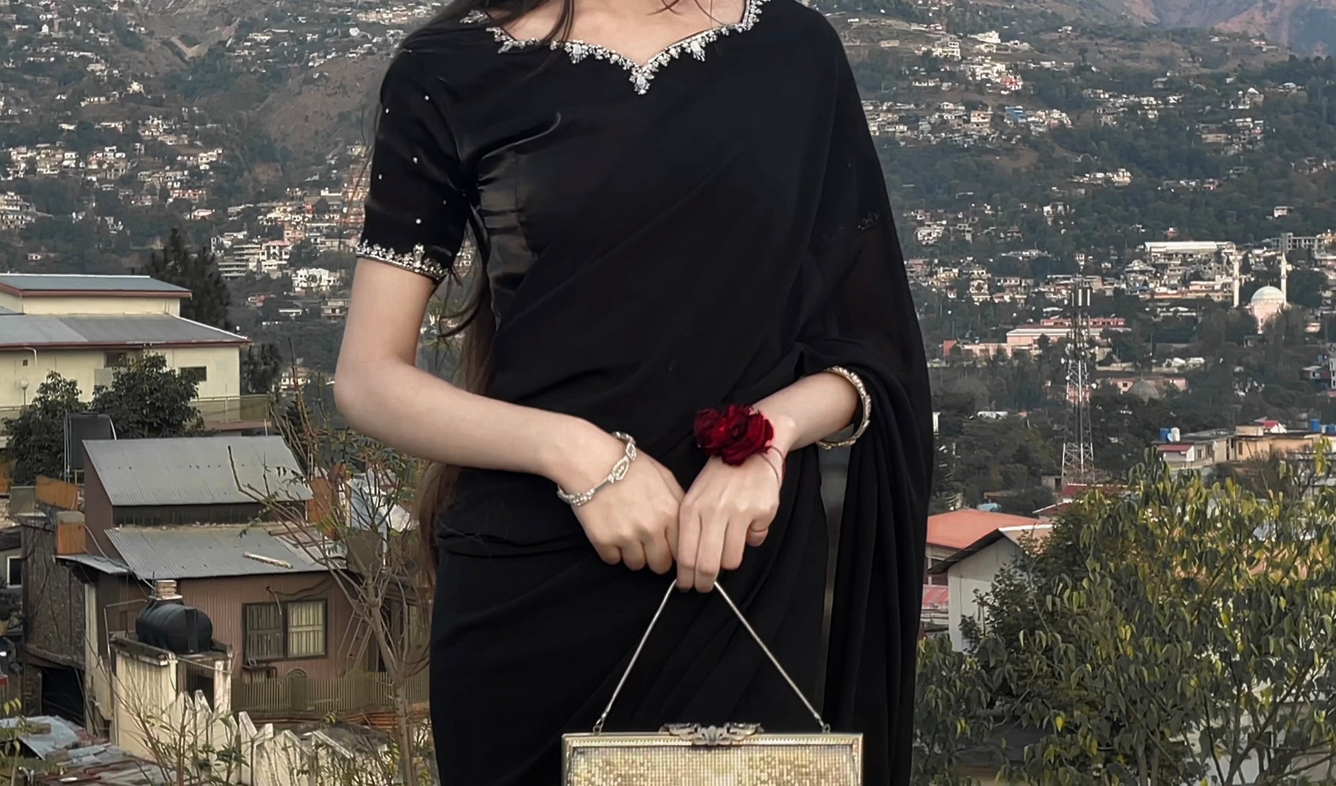 The saree is a plain black fabric, offering a sleek and timeless look. The blouse is crafted from a black fabric as well, featuring embellished, shimmery details that add a touch of glamour. The blouse is intricately decorated with silver handwork, likely in the form of fine embroidery or sequins, enhancing the overall elegance and giving it a sophisticated, luminous appeal. The combination of the plain saree and the detailed blouse creates a balanced yet striking ensemble.